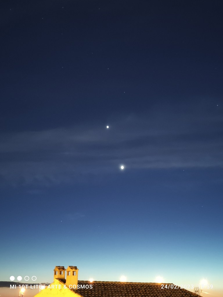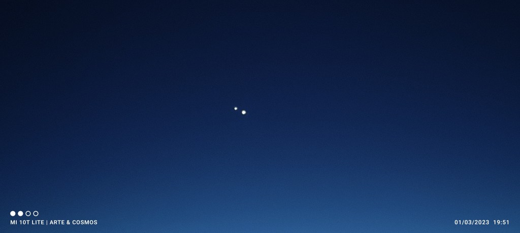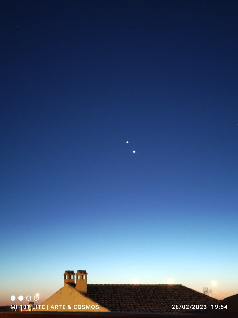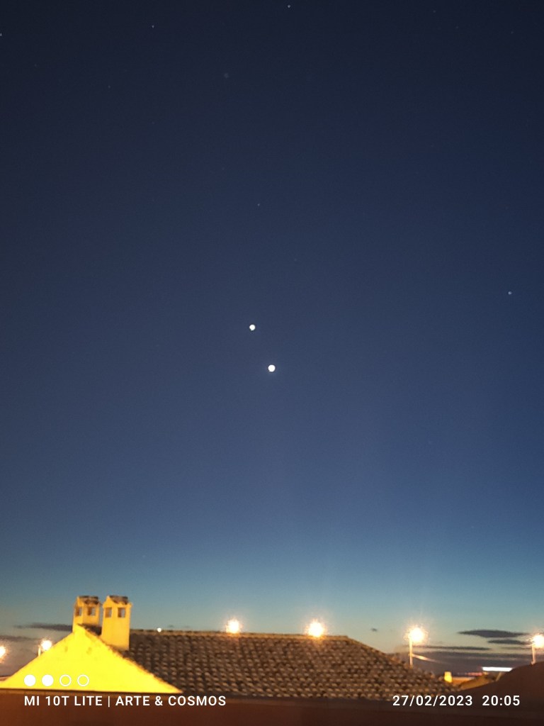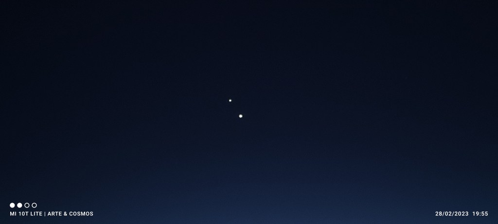 Ambos planetas se irán aproximando lentamente en el cielo en la conjunción de este año 2023 y desde la segunda quincena de febrero hasta principios de marzo brillarán cercanos, por lo tanto un agradable espectáculo de observar cuando lleguen a su máxima aproximación el día dos de marzo, cuando estarán a menos de 30′ de separación es decir, menos que el diámetro angular de la Luna a simple vista.