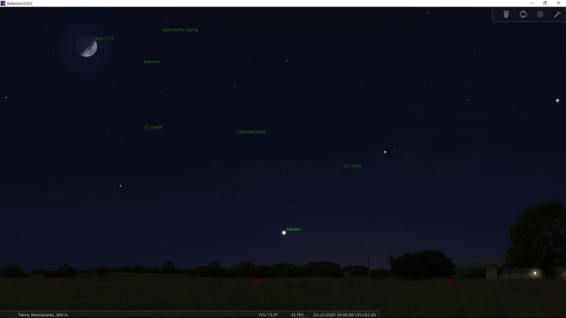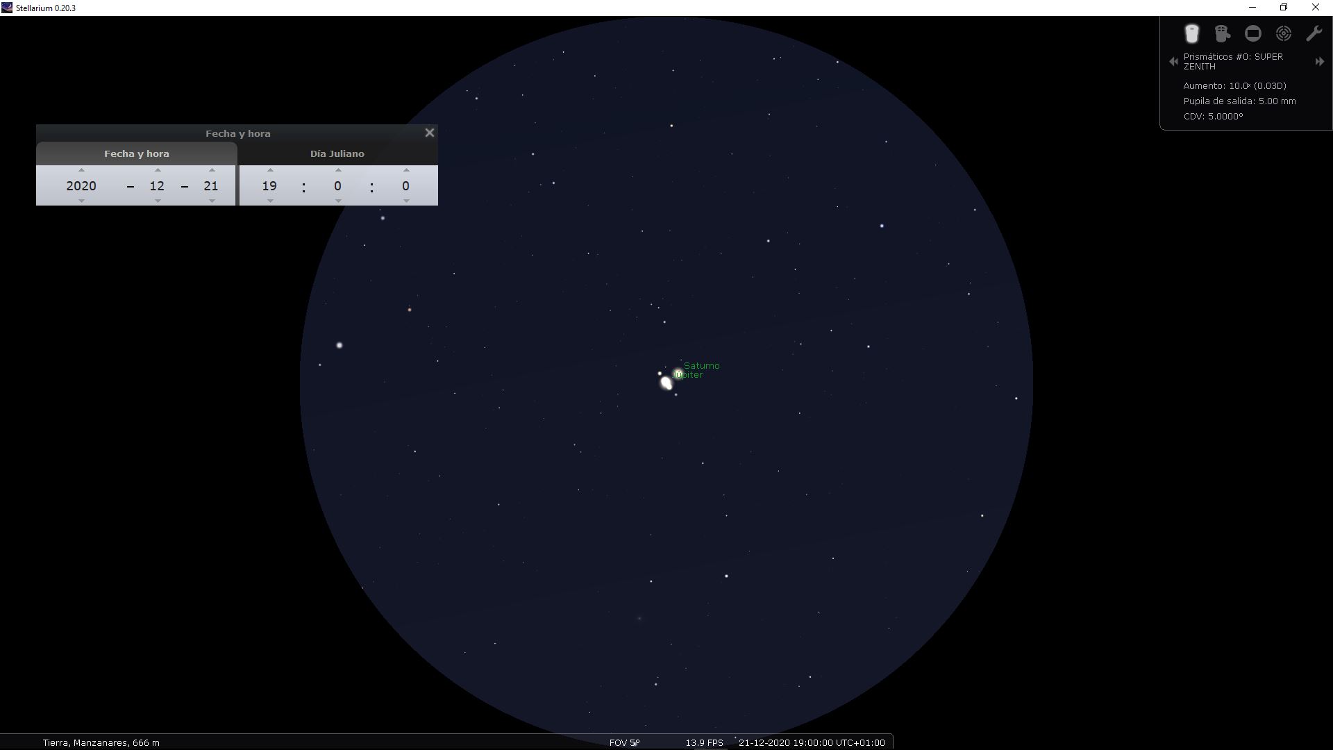 Durante el mes de diciembre de 2020, los planetas gigantes gaseosos Júpiter y Saturno, aparecen brillantes en el cielo al atardecer una vez se ha ocultado el sol. Se irán acercando lentamente, hasta coincidir en la conjunción que tendrá su máxima aproximación el día 21.