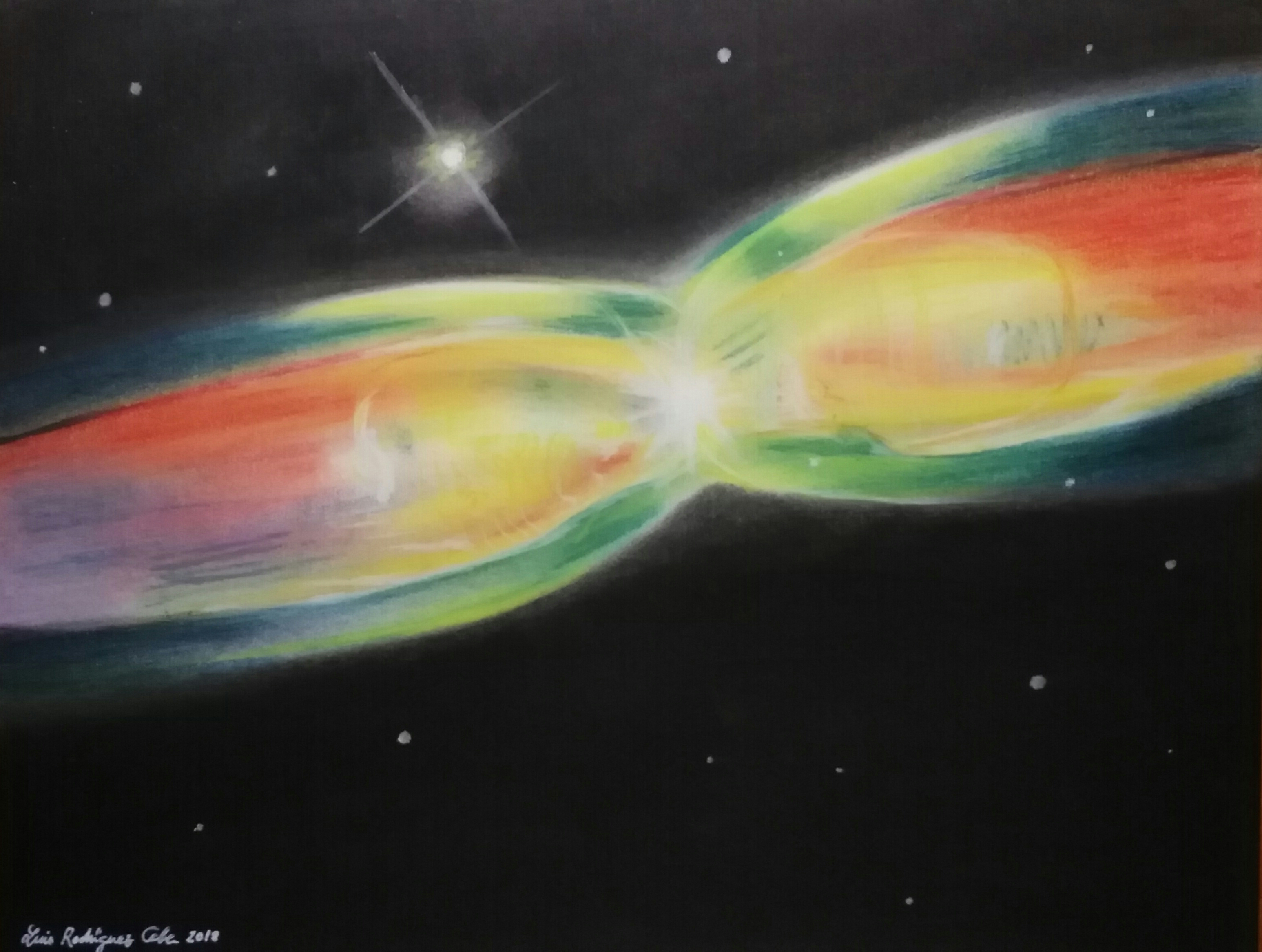 Nebulosa R2-9 Imagen • 03/02/201803/02/2018 • Luis Rodríguez Caba Dibujo con tiza pastel sobre papel blanco realizado para mi canal de youtube Es una nebulosa planetaria bipolar situada en la constelación de Ofiuco Nebulosa M2-9 Comparte esto: Haz clic para compartir en X (Se abre en una ventana nueva) X Haz clic para compartir en Facebook (Se abre en una ventana nueva) Facebook Me gusta Cargando...