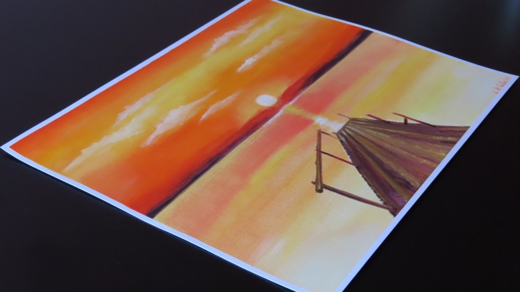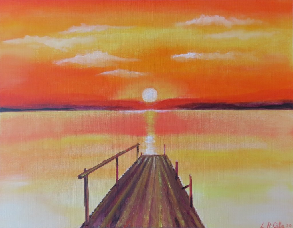 Tonos cálidos y contraste en mi nuevo trabajo de arte al óleo, paisaje de una puesta de sol desde un viejo embarcadero de madera.