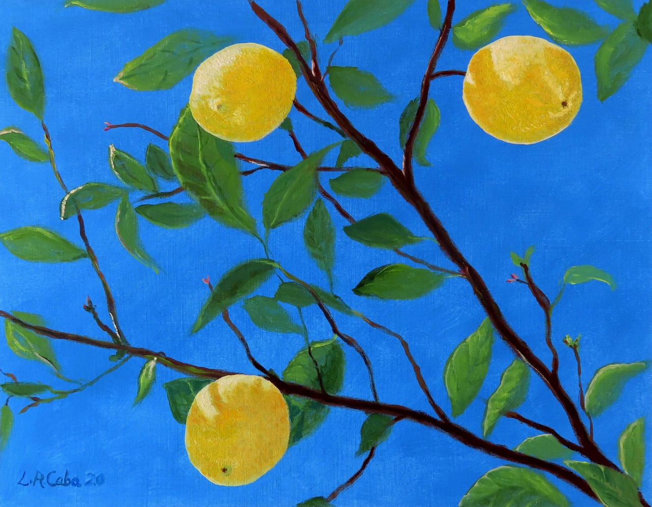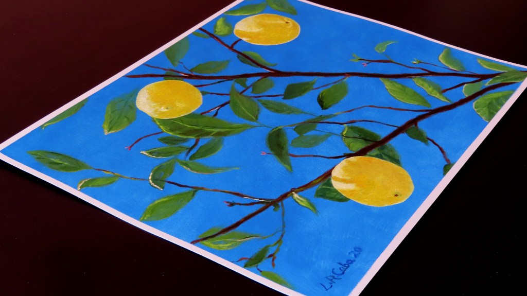Limones, con su bello color amarillo, brillan bajo la luz de un día soleado, azul intenso, colgando de sus ramas, es el motivo de mi nuevo trabajo de arte al óleo.