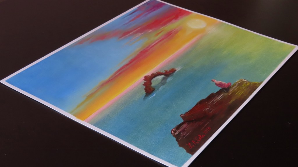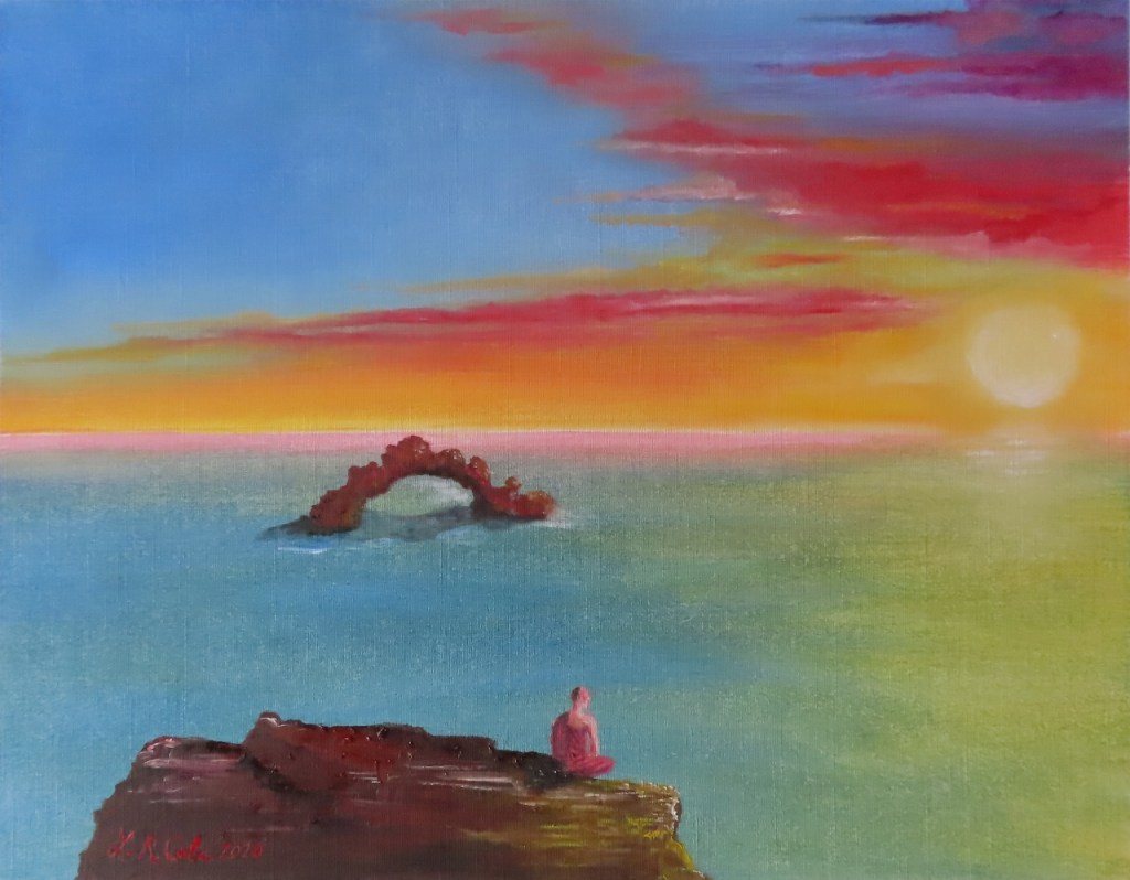 Mi nuevo trabajo de pintura al óleo versa sobre la meditación en la observación de ese momento mágico y bello del atardecer, cuando el Sol toca el horizonte y desaparece dejando un recuerdo de bellos colores.