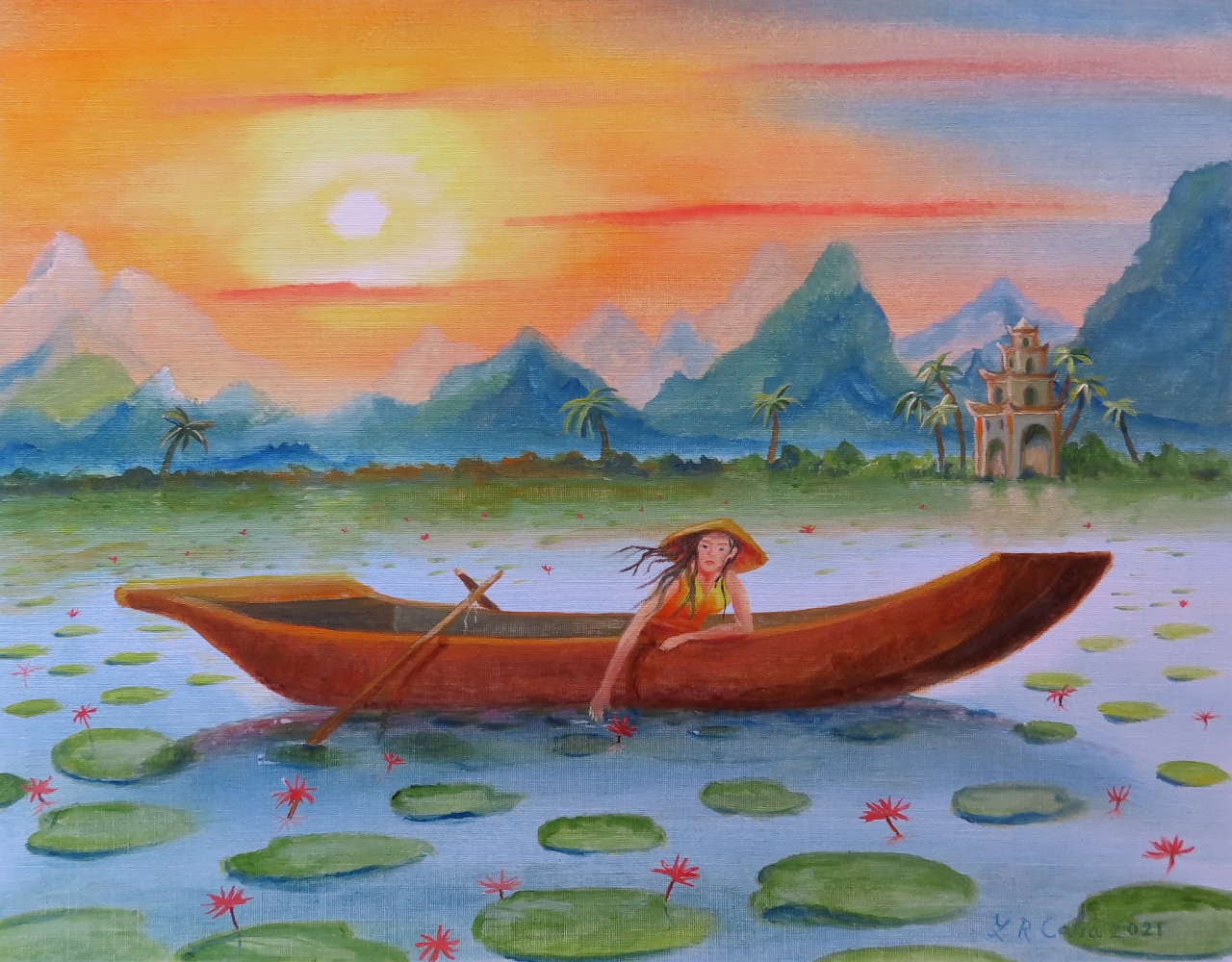 En la pintura reflejo el manto colorido de las flores de Loto, emblema sagrado en Asia y para el Budismo. Es una planta acuática y olorosa que cuenta con distintas funciones en el arte y simbolismo.
