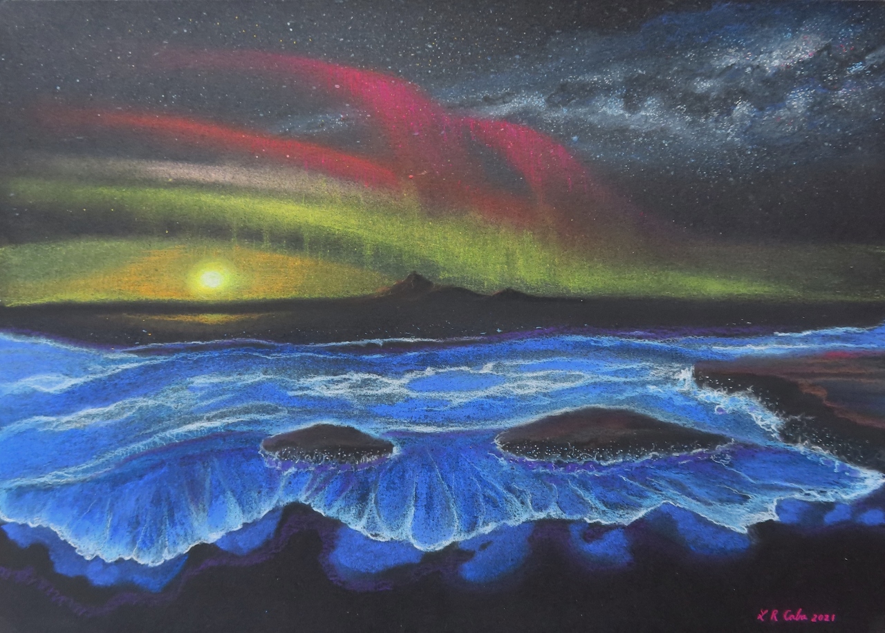En mi nuevo trabajo de arte con tizas pastel, el tema principal es la fluorescencia del mar, un brillo cautivador que se puede ver en playas de clima tropical y que es producido por la bioluminiscencia del fitoplancton, haciéndose más intenso cuanto rompe la ola contra las rocas.