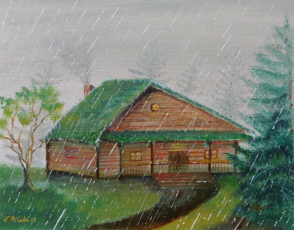 Mi nuevo trabajo de arte al óleo tiene por títurlo, Día de lluvia. No se me ocurre una mejor situación, que pasar un tiempo agradable en una pequeña cabaña en medio de la naturaleza y ver la lluvia caer a través de la ventana, escuchando el suave sonido de las gotas de agua.