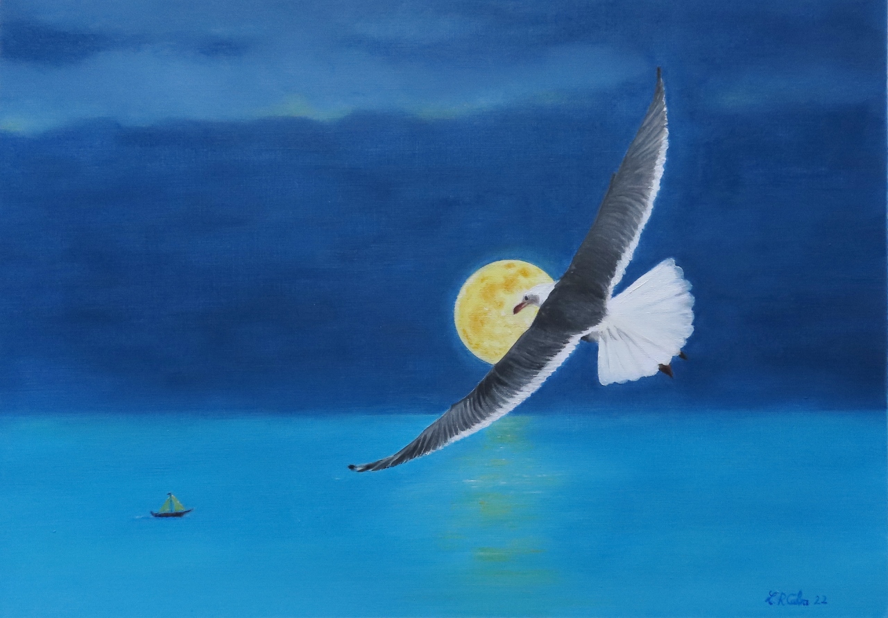 El motivo central es el vuelo alto de una gaviota con la luna de fondo, un viaje de inspiración hacia el cielo para ver lo pequeños que son los obstáculos en la vida a veces. Solo desde un nuevo punto de vista podemos intuir un posible mejor cambio.
