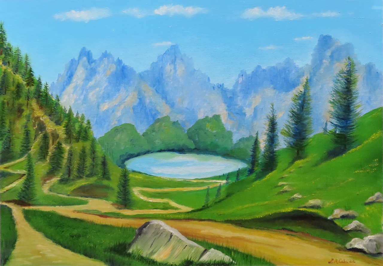 Siempre es emocionate para mí publicar mi nuevo trabajo de arte, en esta ocasión una pintura de un paisaje de líneas sencillas, líneas sinuosas geométricas que convergen hacia el fondo montañoso con un lago.