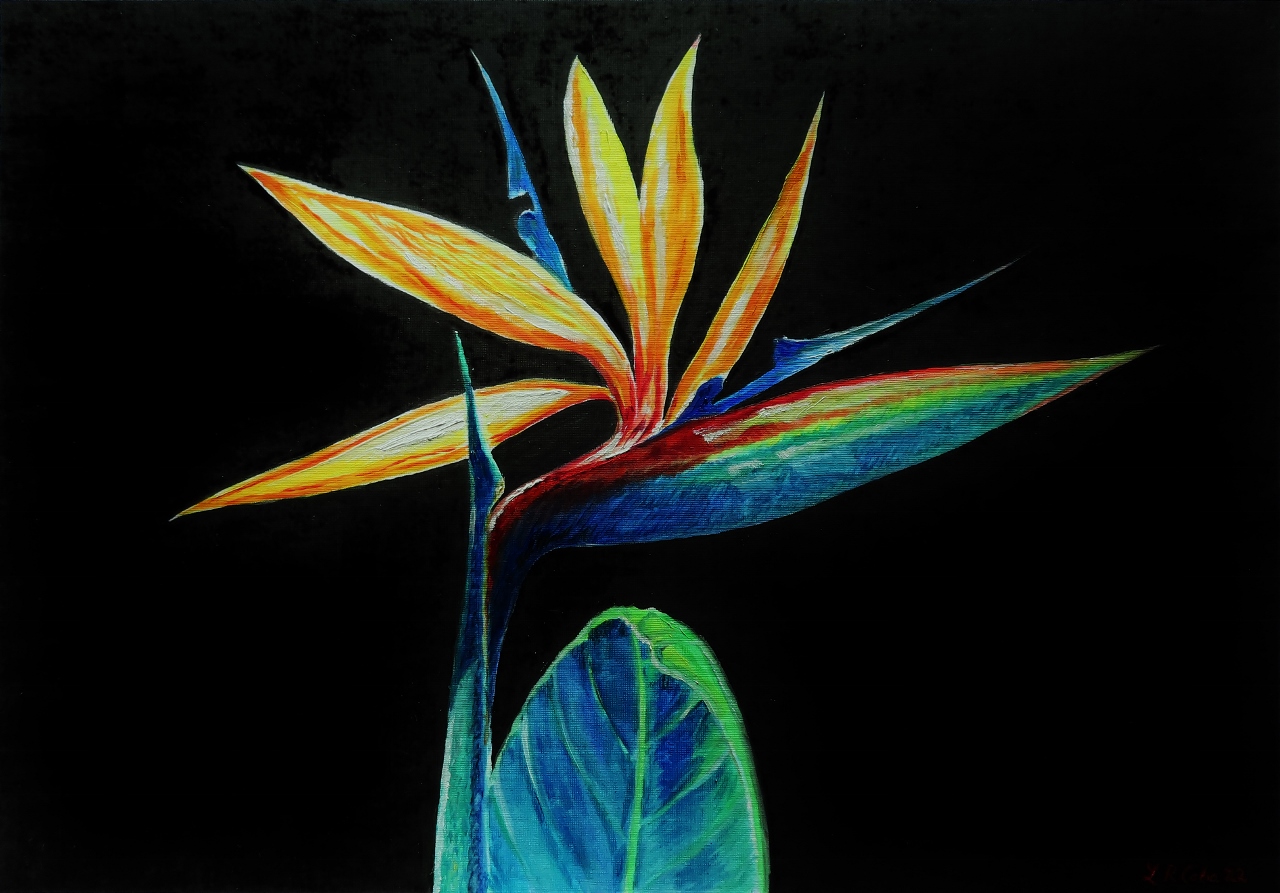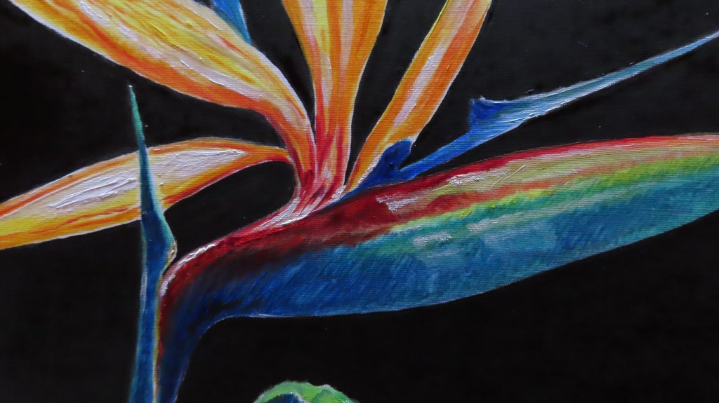 Estoy encantado de compartir mi último trabajo de arte al óleo, «Flor Ave del Paraíso» sobre fondo negro.