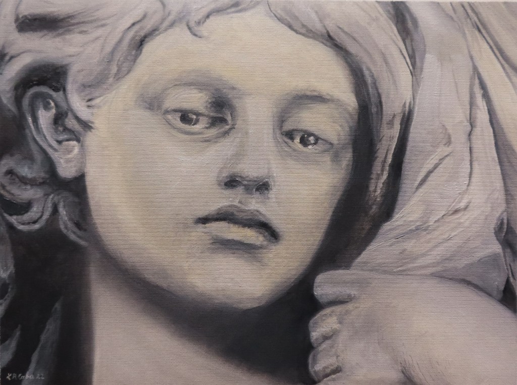 La belleza eterna de las estatuas de piedra y su mirada, en mi nuevo trabajo de arte al óleo titulado «Mirada de piedra», un primer plano en una composición pintada a tres colores, ocre amarillo, blanco titanio y negro.