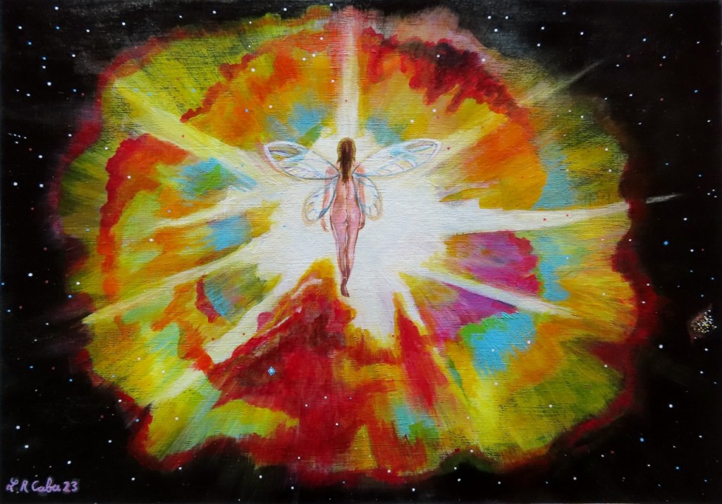 Seres espirituales y mágicos protectores de la Naturaleza que aparecen en innumerables leyendas y que sitúo en una morada celeste, como un portal de acceso a un mundo sobrenatural, en mi nueva obra de arte con acrílicos.