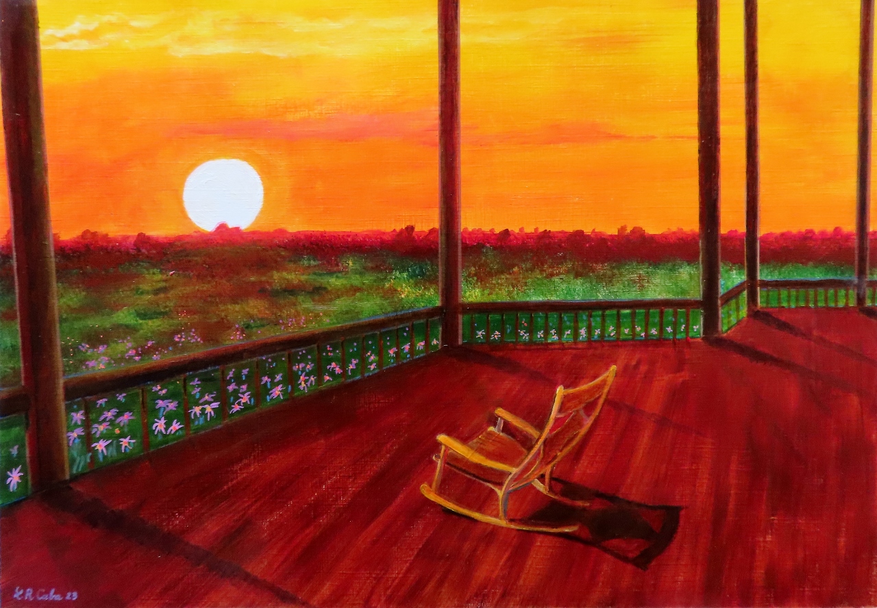 A veces los mejores placeres en la vida son sencillos y, la mejor manera para disfrutarlos es un lugar apartado en el que tener un tiempo tranquilo y relajado. La naturaleza y un amanecer con sus cálidos colores, en el tema central de mi nuevo trabajo de arte titulado, «Mecedora en el porche».