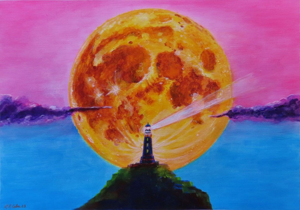 Nuestro satélite natural la Luna en su fase llena iluminando el paisaje con su luz reflejada por el Sol, alzándose en el horizonte visible por detrás de un faro símbolo de seguridad en la que ambos iluminan y nos guían para encontrar el camino.