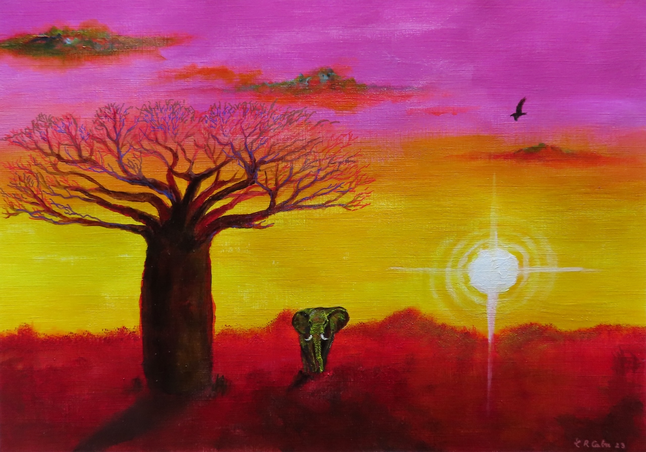 En mi nuevo trabajo de arte con acrílicos el tema central es un «Boabab» solitario en la inmensa planicie africana. Un árbol originario de Madagascar, Australia y África que puede llegar a ser milenario pero que actualmente se ve cada vez menos.