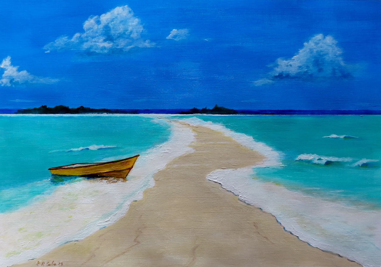 Estoy encantado de compartir mi nuevo trabajo de arte con acrílicos «Camino de arena entre el mar», un trozo de playa que se abre como un istmo entre islas para disfrutar de un luminoso y cálido día.