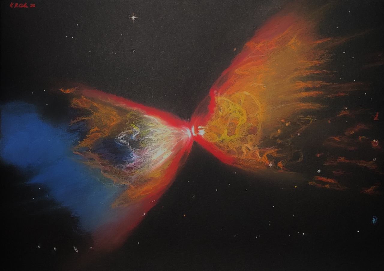 En mi dibujo de «Nube oscura L1527» represento una nebulosa fotografiada por el JWST en la longitud de onda infrarroja y por lo tanto no visible a simple vista. Oculta un disco protoplanetario que está justo en el centro de la nube en forma de reloj de arena, iluminando el gas y el polvo alrededor.