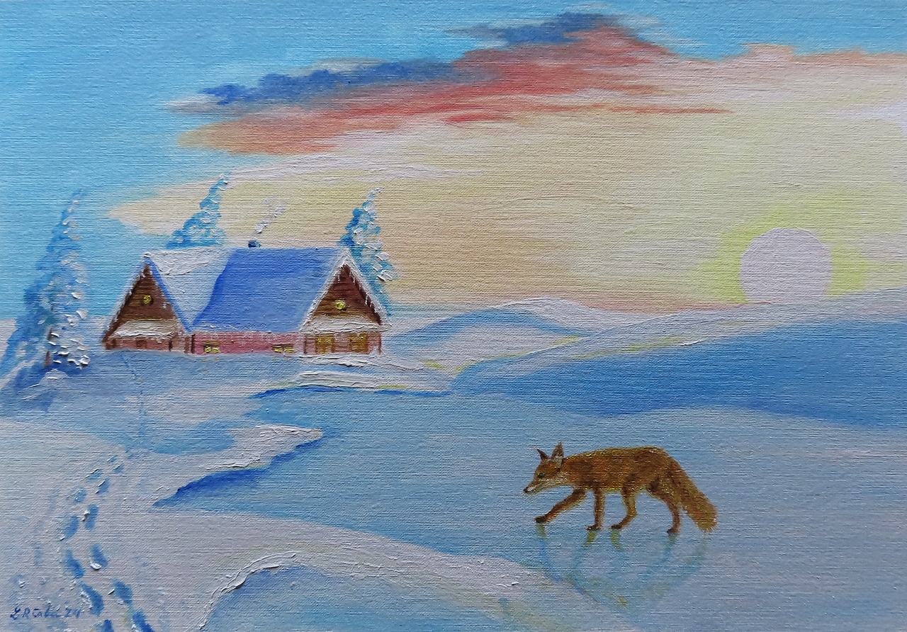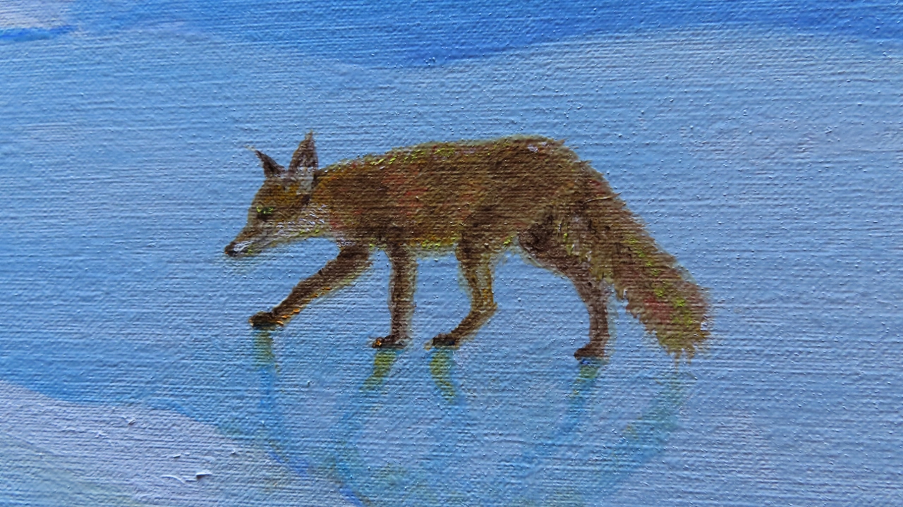 Nueva pintura al óleo para compartir con todos vosotros, en esta ocasión el tema principal es un paisaje con nieve y un lago helado por el que pasa un zorro, animal que se mueve con sigilo, de pelaje rojizo y las puntas de las orejas negras que se extiende por toda la zona paleoártica de la Tierra.