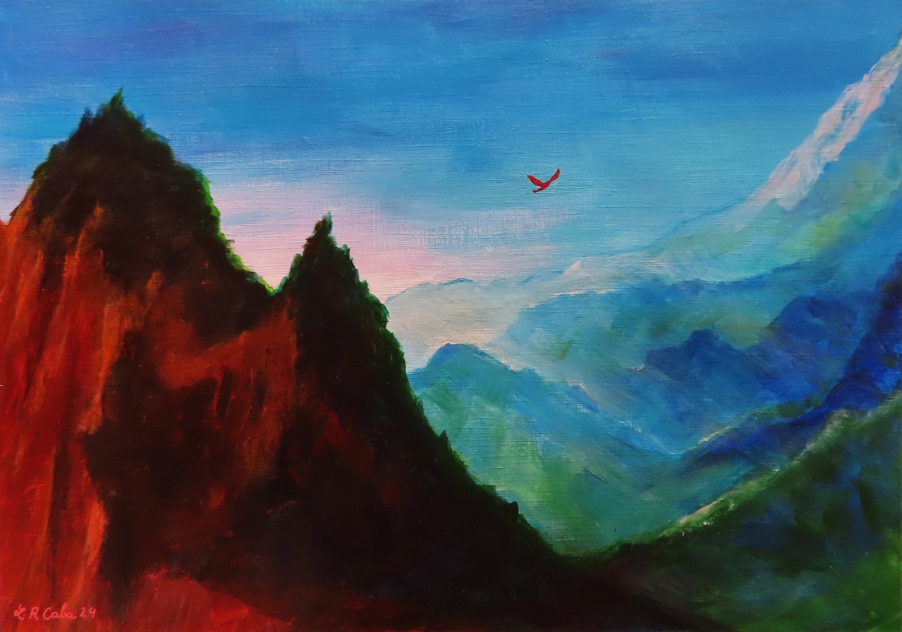 Encantado de compartir mi nueva pintura «Primera luz en las montañas», un sugerente paisaje natural entre brumas.