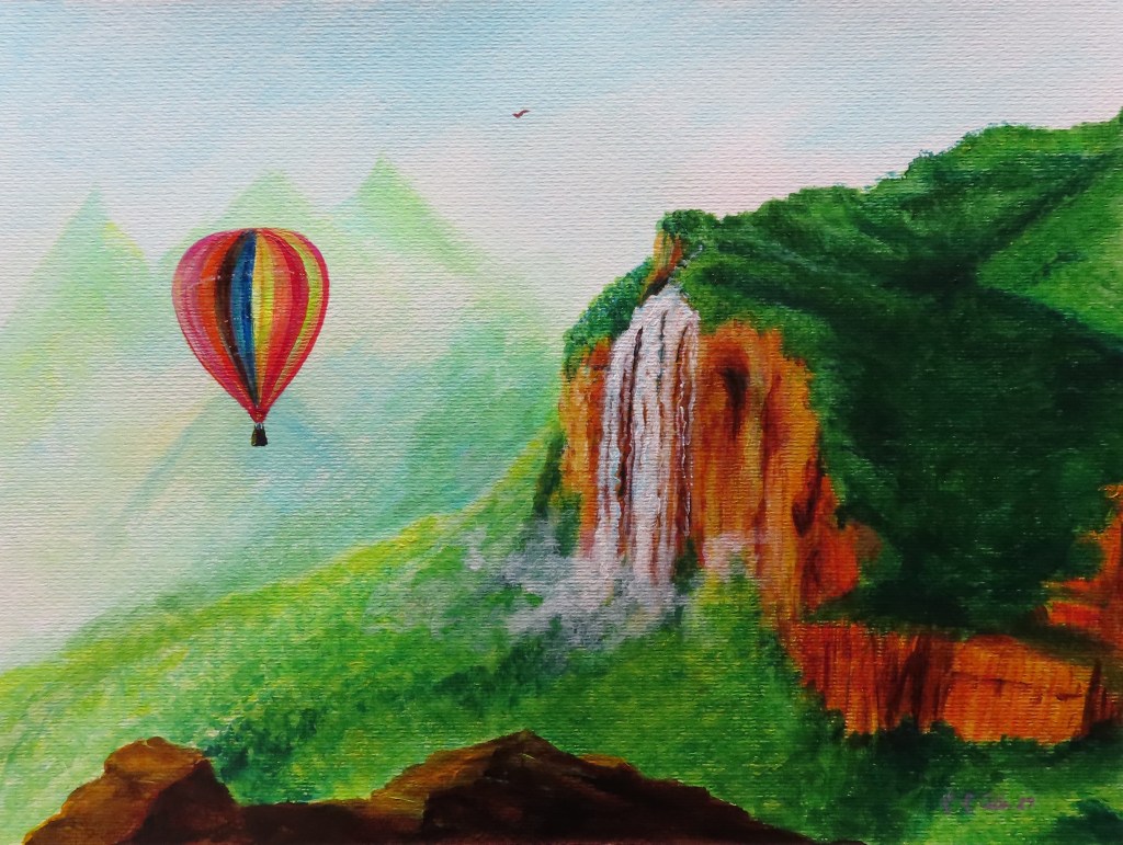 A quién no le gustaría viajar en un globo y visitar sitios maravillosos para poder observarlos desde las alturas como las aves…en mi nueva pintura «Globo aerostático sobre la selva» podemos imaginarlo.