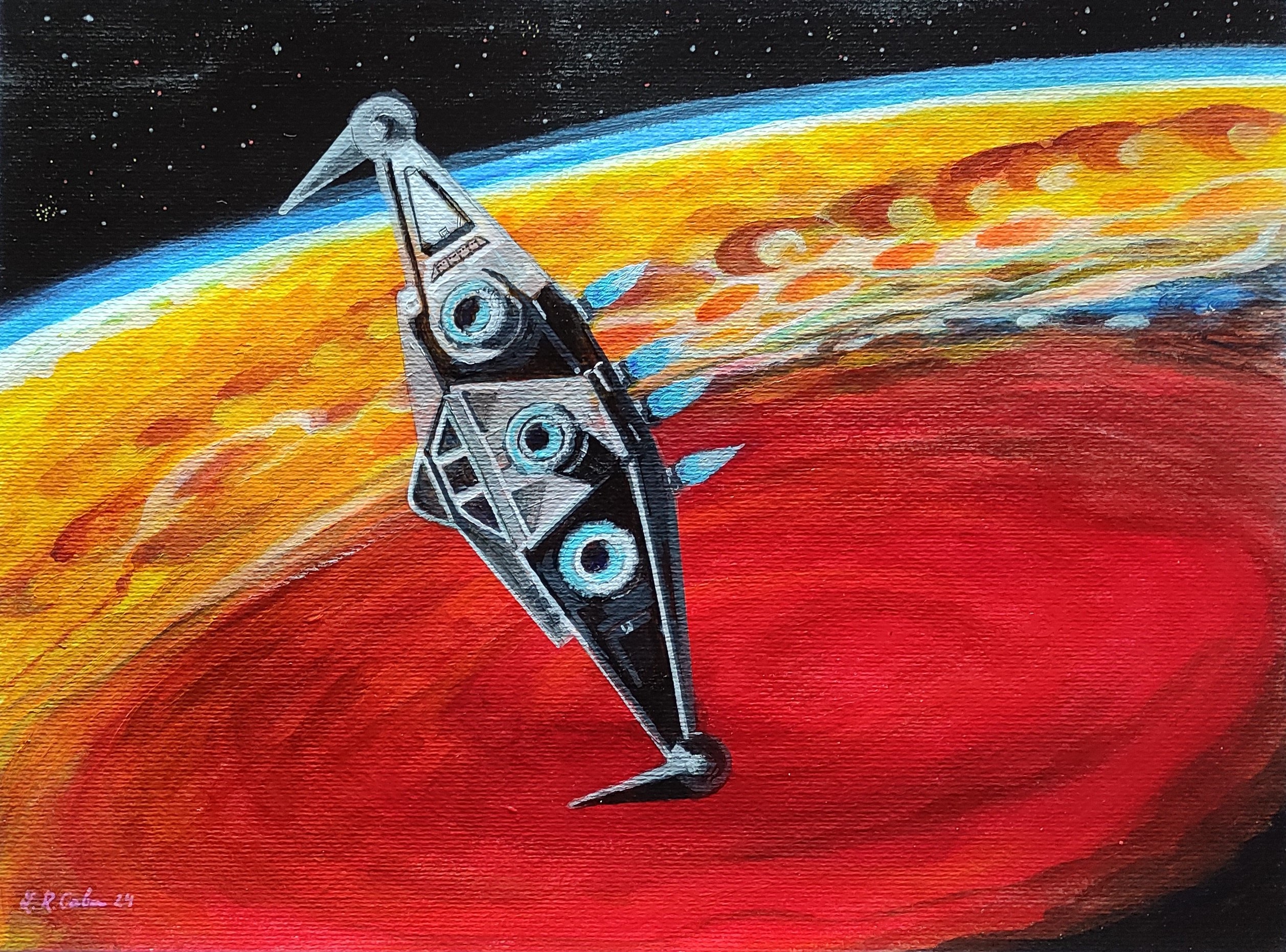 En este nuevo trabajo de arte, más cercano a la ciencia ficción, un viaje de la imaginación en una nave espacial para observar la Gran Mancha Roja en Júpiter… qué extraordinaria visión tendríamos de esta enorme tormenta vista por vez primera en 1664 por el científico Robert Hooke.
