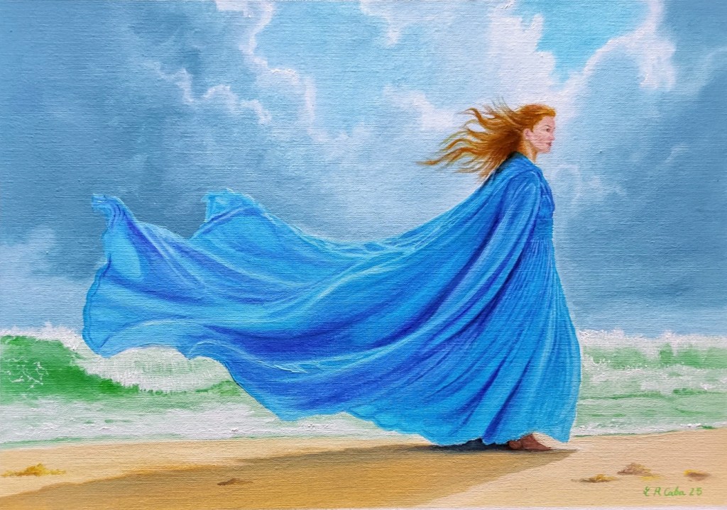 En esta pintura «Mujer con vestido azul» tenemos representada un figura femenina en una playa donde se levanta el viento de una posible tormenta. La mujer lleva un vestido azul que ondula con el viento.