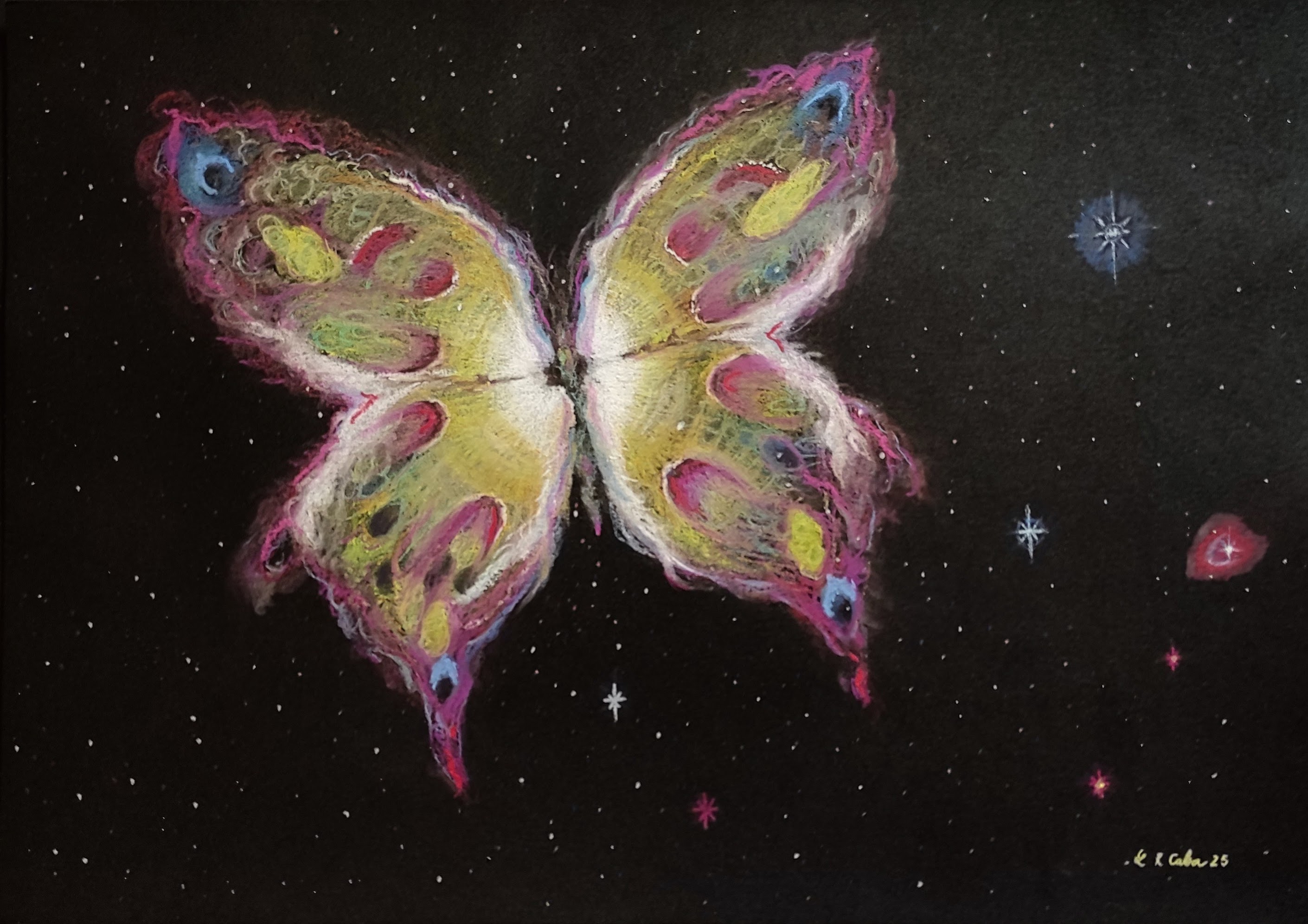 En mi trabajo de arte he querido mostrar una imagen de fantasía que representa una nebulosa con forma de mariposa sobre un tapiz de estrellas…evocación de espiritualidad en el espacio…el tiempo…eternidad…