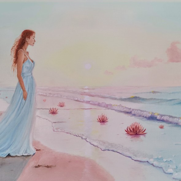 Mujer en una playa con nenúfares al amanecer 🎨