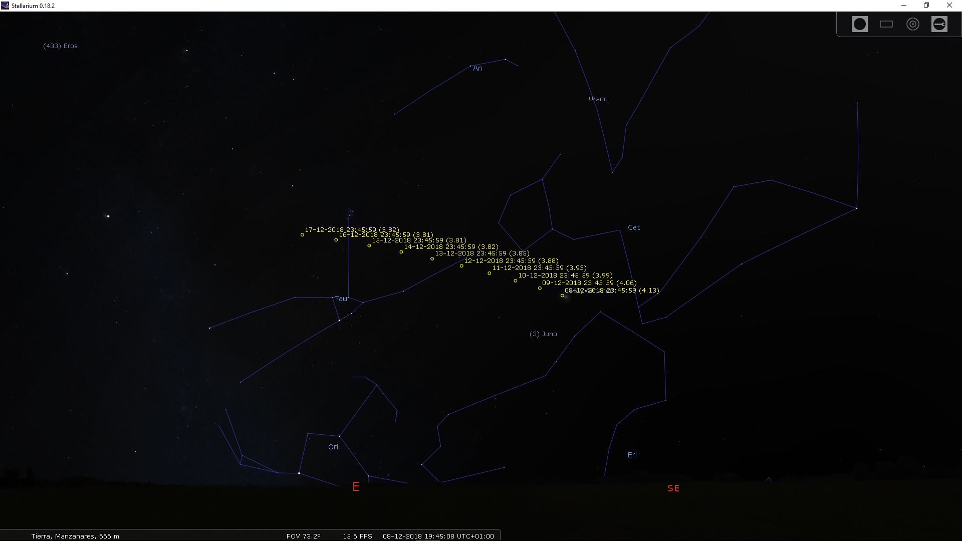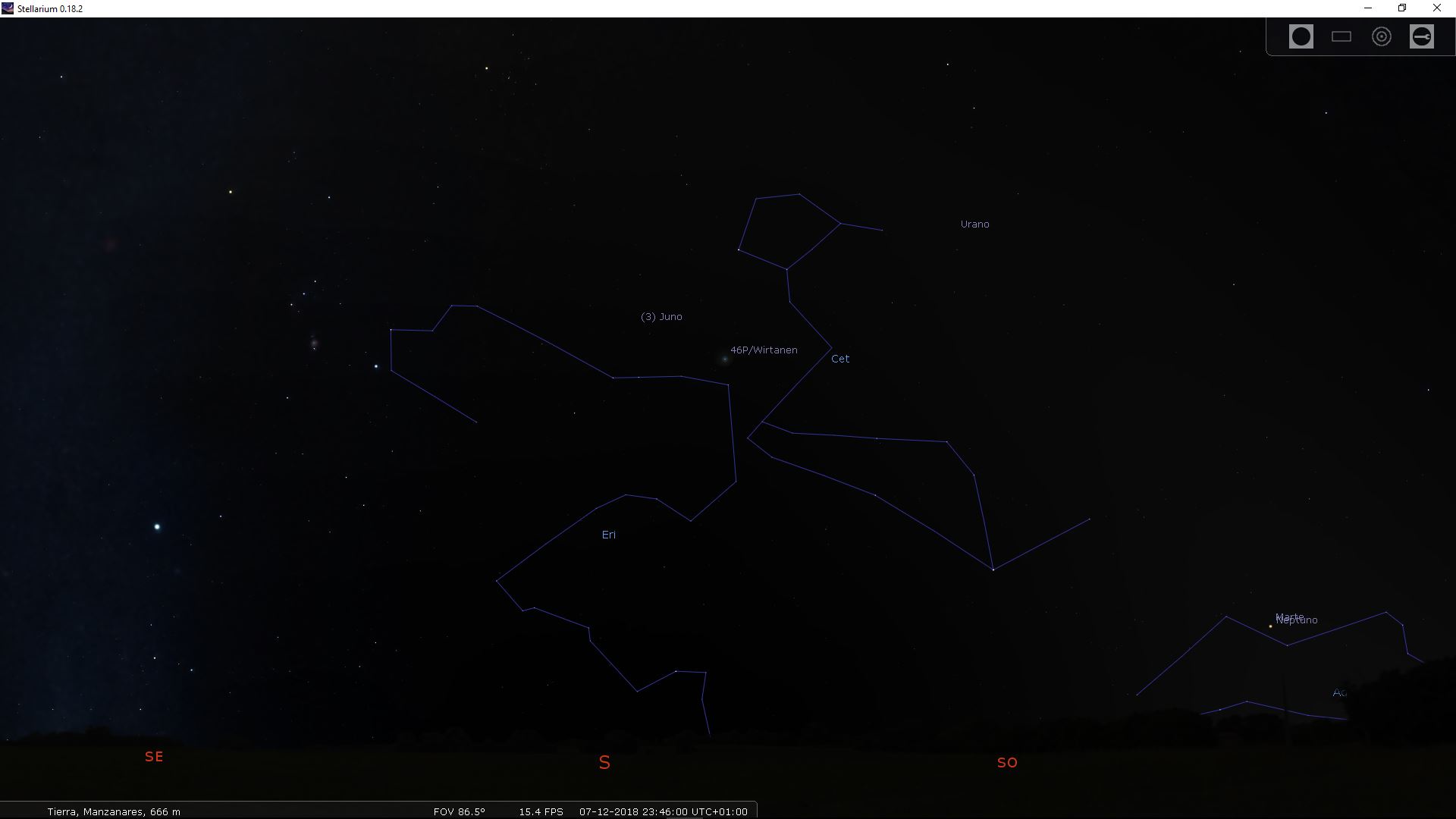El cometa 46P/Wirtanen se puede observar actualmente en nuestra latitud mirando en dirección sur hacia la constelación de Eridanus, hacia las 23h. 46′ tal y como se muestra en el gráfico a continuación.
