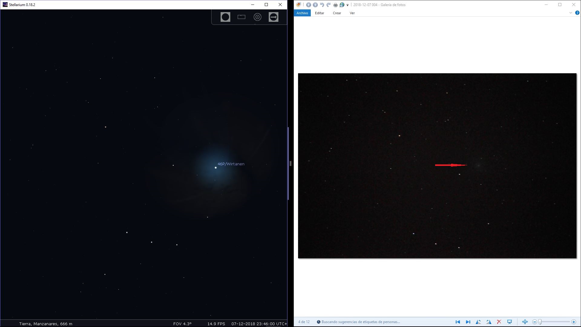 Comparativa del campo estelar y la fotografía . El cometa 46P/Wirtanen aparece como una pequeña mancha difusa con magnitud 4.22 según las efemérides, la estrella más brillante a su izquierda es de magnitud 6.20 como comparación.