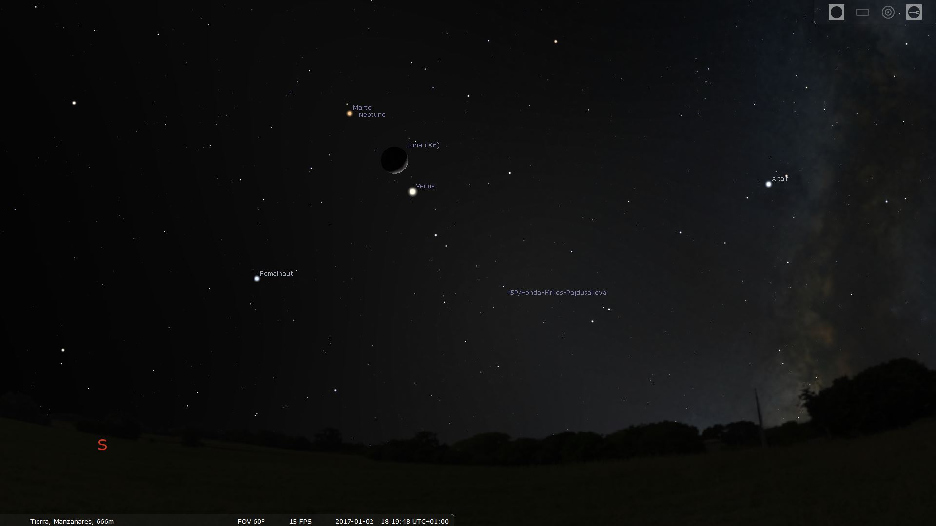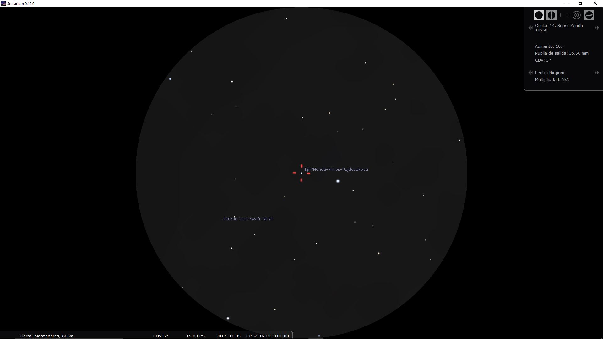 A partir del mes de enero y una vez se oculte el sol se puede empezar a ver el cometa 45/P Honda-Mrkos-Pajdusakova que actualmente tiene magnitud 7.15 aproximadamente. Válido para latitud norte, Manzanares está a 39º.