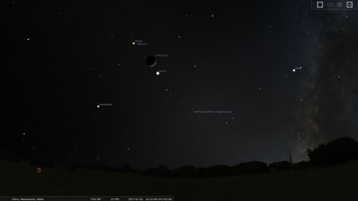 En esta imagen podemos ver la vista del cielo una vez ocultado el sol el día 5 de enero, y la posición del cometa en la constelación de capricornio muy bajo en el horizonte.